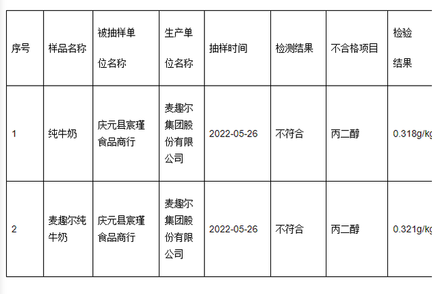 昨日上午,“新疆麦趣尔纯牛奶不合格”冲上热搜第一。根据浙江省庆元县市场监管局公示2022年第4期食品抽检检验情况,两批次麦趣尔集团股份有限公司生产的纯牛奶被检出含有丙二醇因而不合格。受此消息影响,麦趣尔股价直接一字跌停,截止昨日午间,麦趣尔报收于7.98元,总市值为13.9亿。较上一个交易日,麦趣尔市值缩水1.55亿。