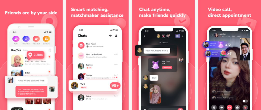 在笔者注册的男性用户视角下,以笔者“金融从业者、28 岁、研究生、182”的条件下,在“同城”版块给笔者推荐定位用户多为 18-25 岁,多数为学生、销售员、个体经营等相关职业。从对方定位和使用语言来看,确为东南亚本土用户,不少用户头像自拍带有头巾。