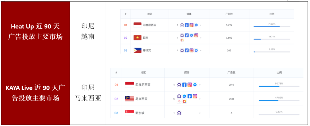 根据 App Growing Global 数据,Heat Up 近 90 天广告素材投放 Top3 市场分别是印尼、越南和菲律宾,KAYA Live 则选择了印尼、马来西亚和新加坡。