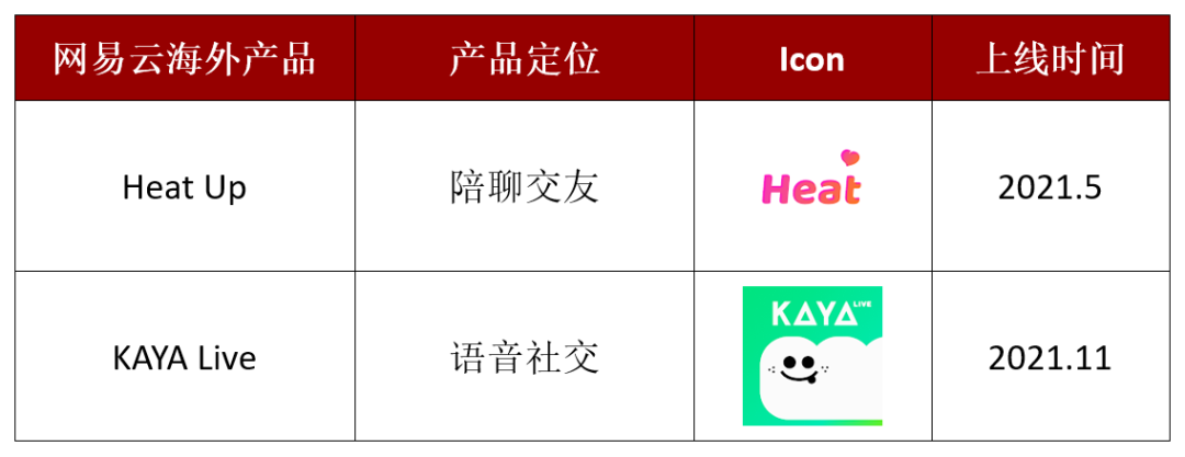 2021 年 5 月网易云把国内付费陪聊「心遇」 做成了海外版本 Heat Up;2021 年 11 月又照葫芦画瓢把语音社交「Look 直播」 复制到海外推出 KAYA Live。