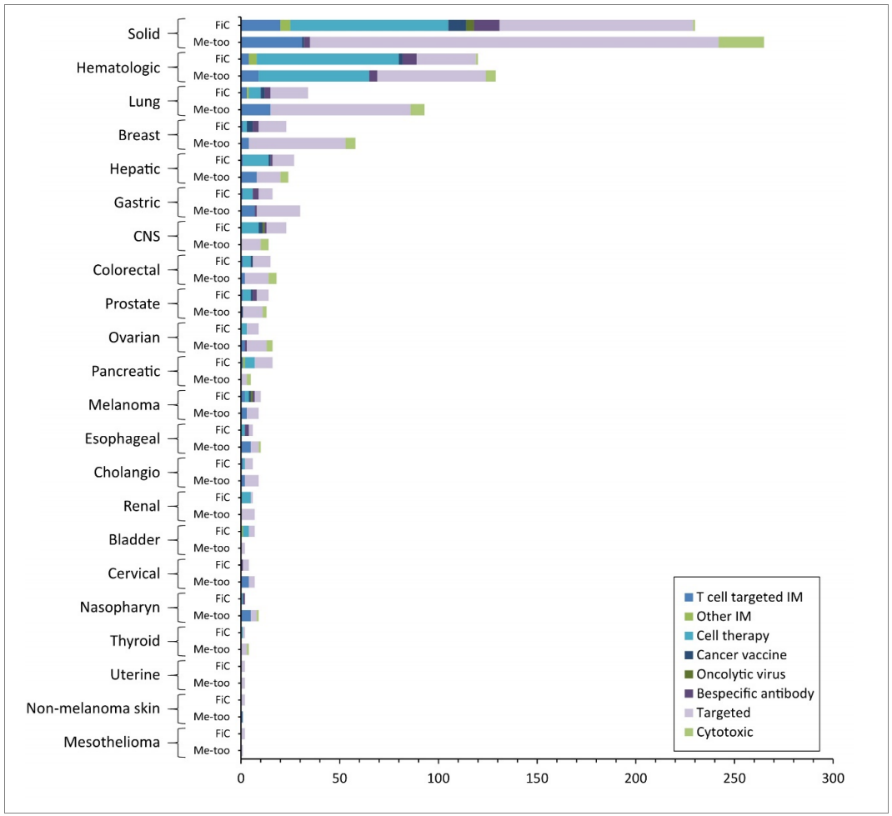 试以肿瘤药为例。不同癌种之间,研发竞争格局其实差异非常大,无论是从不同渠道的统计数据,还是业内直观感受,大概都能发现血液瘤、淋巴瘤新药研发竞争激烈程度都远超过实体瘤(尤其考虑还有CAR-T分掉一块)。
