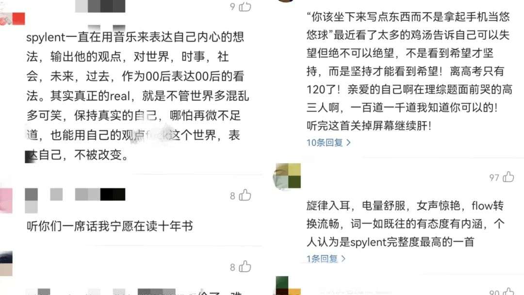 对于受众来说,说唱是寻找认同感、表达自我的一种方式,同为Z世代的高校说唱歌手们在共情上优势明显。可以看到,很多年轻rapper发表了不少讲述年轻一代的个性、责任与反思等的作品,在这之中处于“意见领袖”的地位。这也就不难理解,为何刚升入大学的00后说唱歌手Spylent,所写出的《表达者》《恶贯满盈》等歌曲能够在00后群体中获得极大反响。