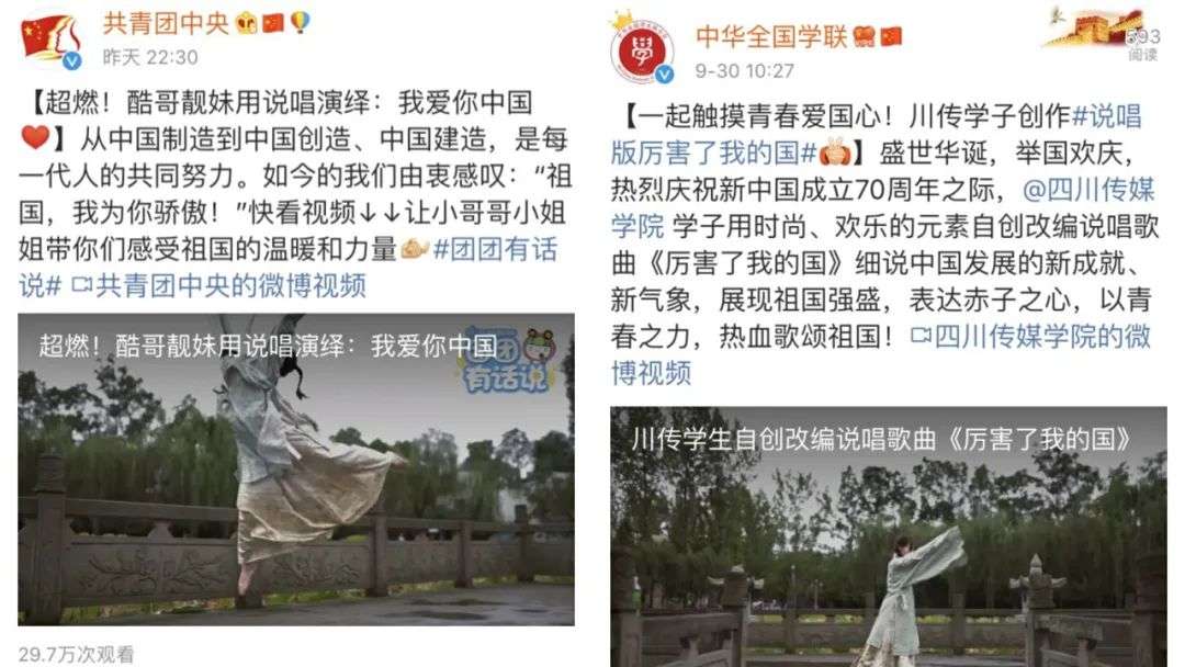 2019年,四川传媒学院的rapper就曾发布《厉害了我的国》说唱改编版,获得了共青团中央、人民日报等转发点赞,全网视频播放量突破百万。而这也影响到身在官方主流的发声口,像是共青团中央在入驻B站后,便发布了一首贴合年轻群体的说唱作品《我们这一代》。