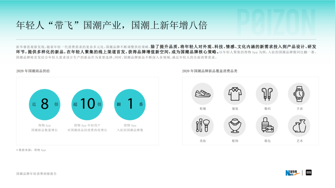 根据新华网与得物App在今年联名发布的《国潮品牌年轻消费洞察报告》显示,年轻人正在“带飞”国潮产业,国潮上新年增八倍。比如主打说唱潮流文化的首饰品牌GlacierBoy,其在与说唱歌手合作下,2019年双十一期间创下了销售额35万元。