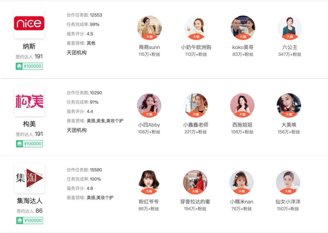 与美ONE形成强烈对比的是,次超头主播烈儿宝贝、陈洁kiki等主播背后的君盟、宇佑文化等机构,不见和阿里系等资本之间有所关联,而君盟和宇佑文化均有十余位头部达人。纳斯、构美、集淘达人等头部机构更是靠签约大量肩部、腰部主播数量取胜,拥有80-200位左右的直播达人。