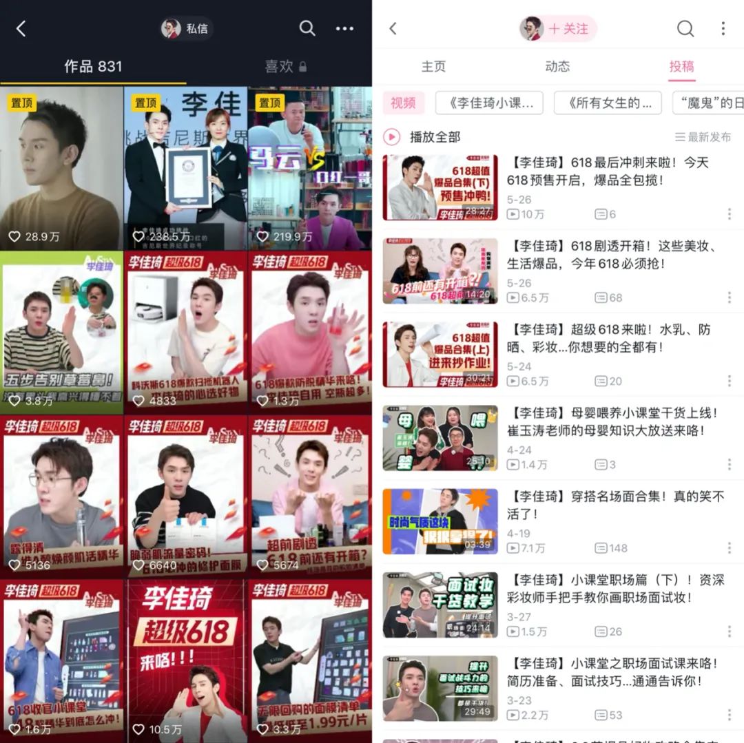 淘宝直播是李佳琦的主阵地,李佳琦仅在淘宝直播做直播,其他平台对于李佳琦来说,则都是流量导管。李佳琦的微博和公众号,已经成为直播间预告工具,其抖音、小红书和B站账号有一定比例的美妆护肤教学型内容,但更多的内容仍是种草和淘宝直播预告。