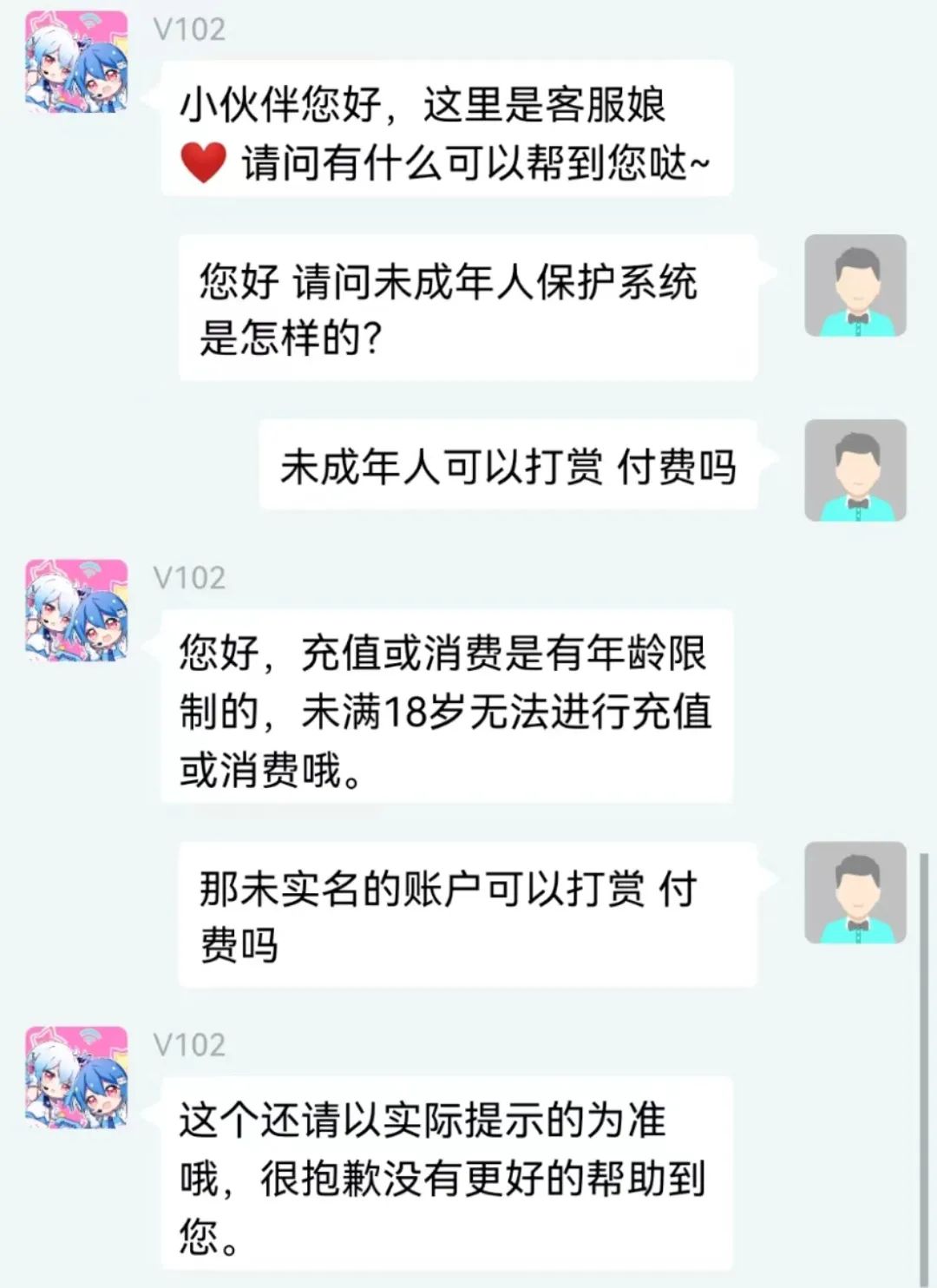 在虚拟主播和粉丝们中,时常流传着“不怕大哥不打钱,就怕大哥未成年”的调侃。由于隔着网络,无法直接识别粉丝是否成年,为了避免风险,部分主播在直播间中会显著标明“未成年不要打赏”的字样。