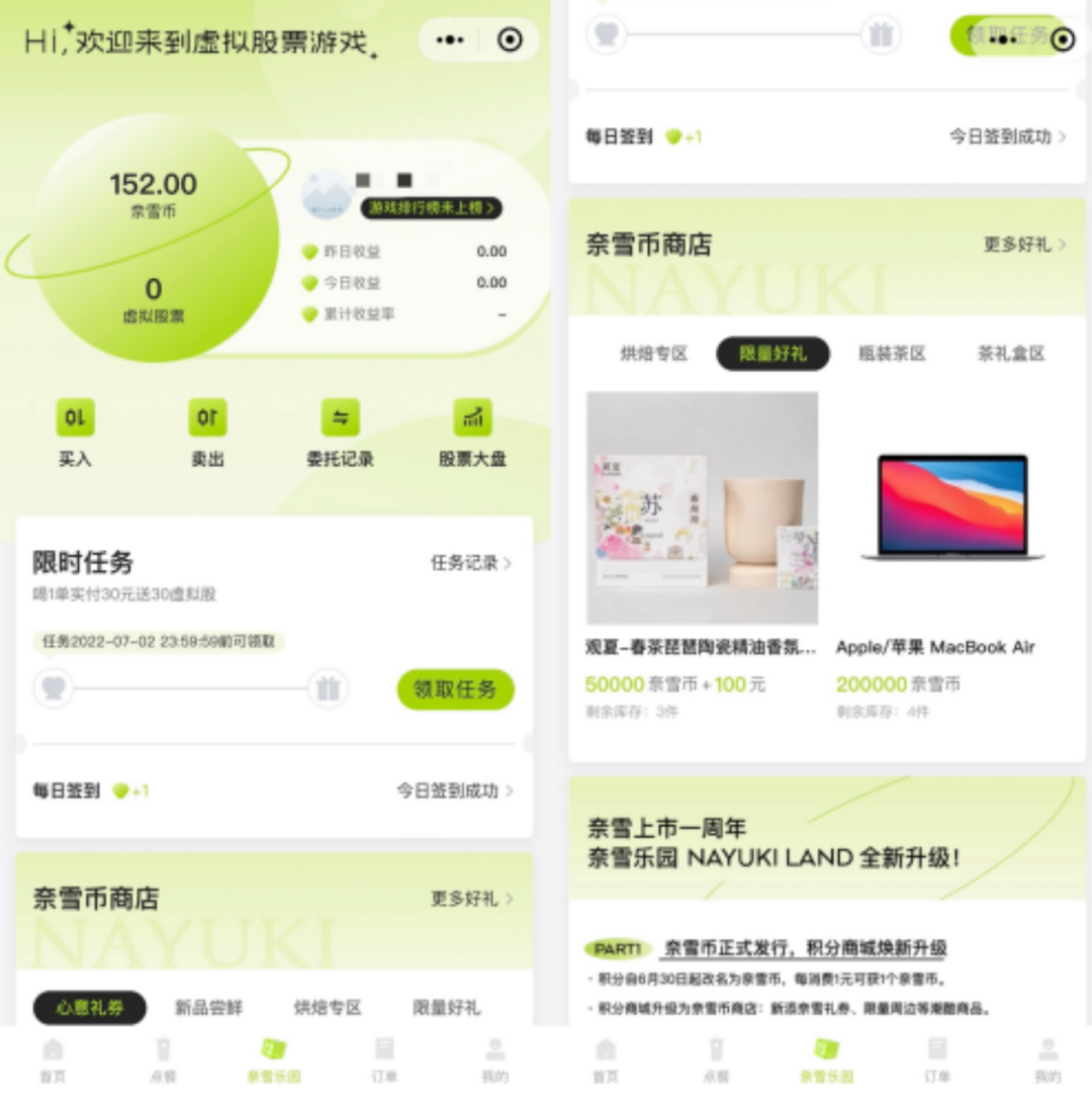另一方面,虚拟交易所会吸引用户反复进入点餐小程序查看行情和进行交易,无形中增加了潜在的成交行为。而炒虚拟股票又必须从购买饮料积累奈雪币开始,蜂拥而至的投机客很有可能为奈雪带来短时间内茶饮销量和充值额度的激增,直接刺激营收增长,带动真实和虚拟股价联动提升,吸引更多玩家入场。
