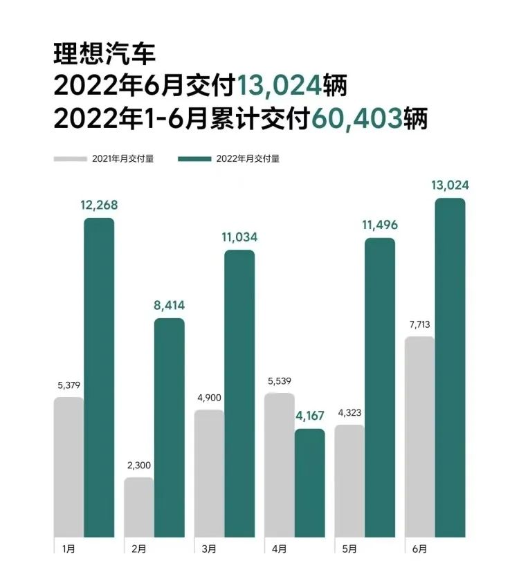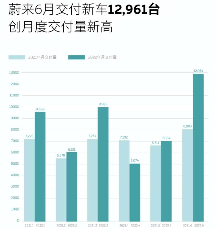 蔚来于2022年6月交付新车12961辆,同比增长60.3%——从销量上逼近理想略逊于小鹏。但这也是蔚来上半年唯一一个月单月销量破万,创造了蔚来月度交付量的新纪录。