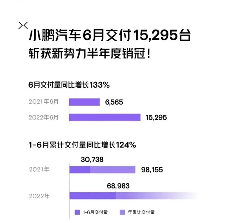 小鹏保住了单月销量第一,并且在上半年交付量成绩也位列新造车第一。6月,小鹏汽车交付量为15295辆,同比增长133%。三款车型中,P7仍然是“中坚力量”,6月交付8045辆;小鹏P5也开始上量,达到5598辆;小鹏G3系列交付1652辆。