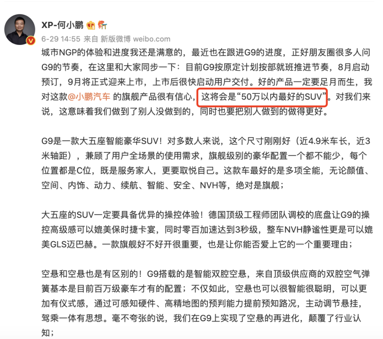 40万级市场,小鹏也是有准备的。为了保持“同步”,何小鹏微博上“官宣”了新车型G9的进展:8月启动预定,9月正式上市,并称G9是“50万以内最好的SUV”。