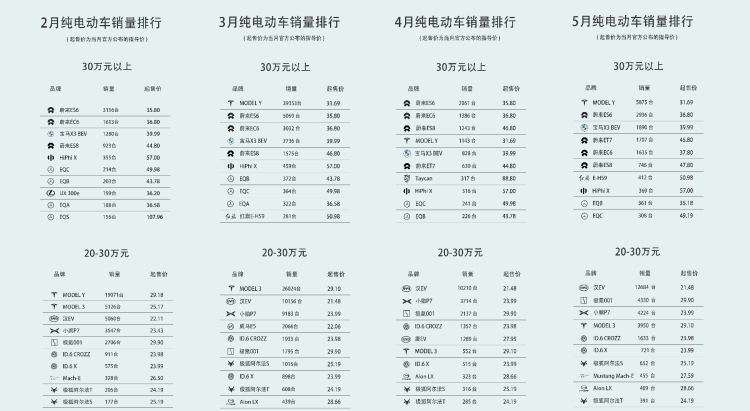 今年2-5月,蔚来、小鹏在纯电动细分市场并无交集 图源:来自网络