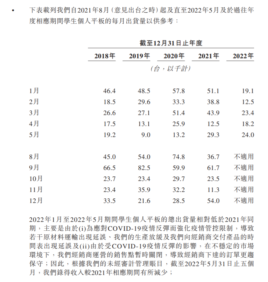 对于2022年1-5月期间的学习平板出货量下滑,除了疫情影响原材料和生产之外,读书郎还给出了经销商门店疫情下暂时关闭,导致经销商下达的订单更加保守的原因。