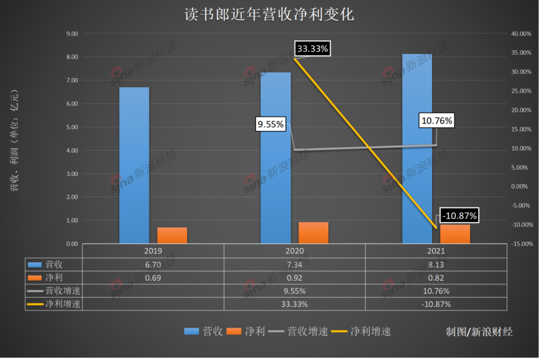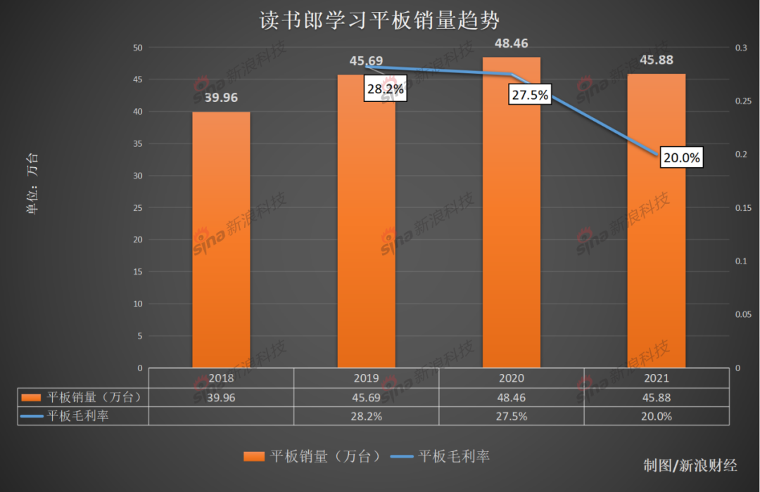 2021年,读书郎的整体毛利率从2020年的27.5%下降至20.8%;净利润也从2020年的0.92亿元下降至0.82亿元,同比下滑超10%。
