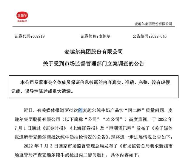 对近日因纯牛奶检出丙二醇问题受到市场监督管理部门立案调查一事,7月4日,麦趣尔发布公告称,公司深表自责,诚恳向广大消费者道歉,对给各方造成的困扰深表歉意,麦趣尔公司将进一步提升业务合规和管理水平,切实履行社会责任。