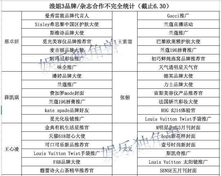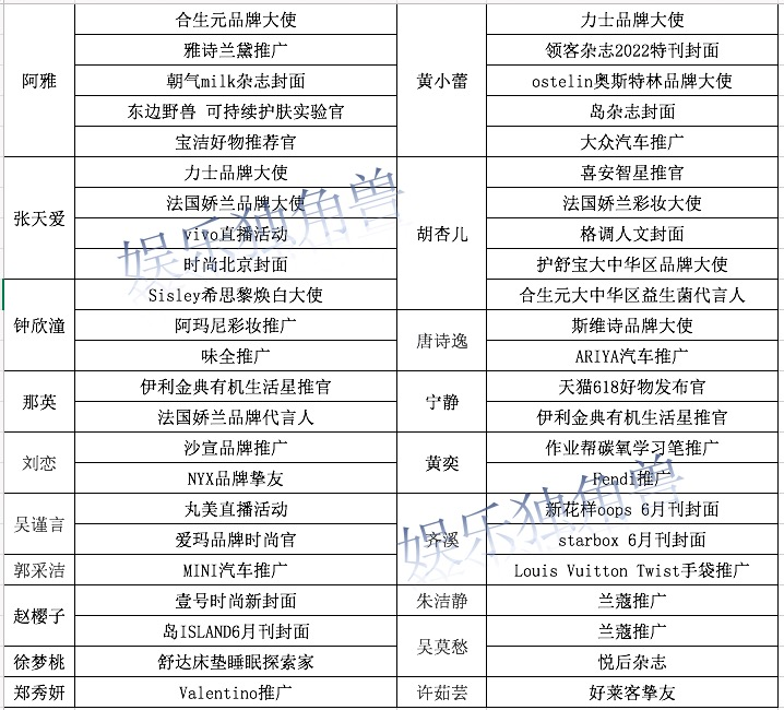 拿下最多品牌合作的蔡卓妍,只有曼秀雷敦是品牌代言人,其他多是品牌大使和推广;王紫璇的品牌合作有点出乎意料的多,但以推广、直播为主;于文文主打杂志封面……除此之外,就是那英、胡杏儿这样的成熟艺人,有代言人合作。
