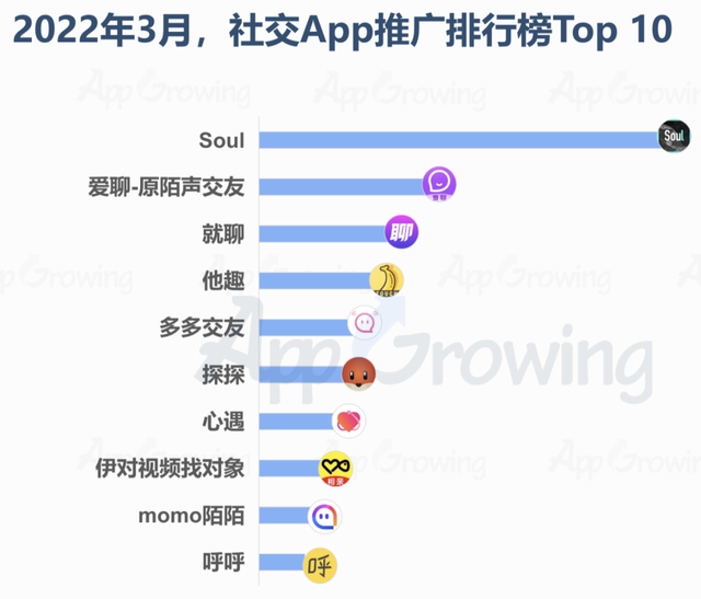 根据App Growing监测的今年1月应用App买量数据,Soul仅次于陌陌排在社交App推广排行榜的第二位,3月则成为第一,4月又回到第二的位置。