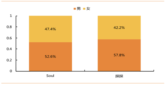 这就导致Soul和探探用户性别比例略有不同。艾瑞咨询此前在一份报告中列出Soul的两个特点:1)24岁以下用户在用户中占比小幅高于探探中该用户群占比;2)女性用户在用户中占比小幅高于探探中该用户群占比。