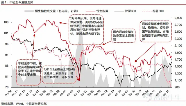 2022年前几个月,港股在海外流动性收紧、地缘风险升温、疫情扰动的多重不利因素下持续下行,海外中资股持续下挫,3月中旬,恒生指数一度跌至18235.48点。在3月16日开始释放“政策底”利好后,港股止跌企稳。