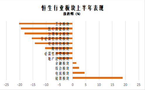 据中国证券报数据,2022上半年,恒生行业版块跌多涨少。值得注意的是,能源版块涨势一骑绝尘,上半年累涨近19%,而工业版块则成为大“冷门”,累计跌幅超20%,医疗保障和公共事业版块也跌近20%。