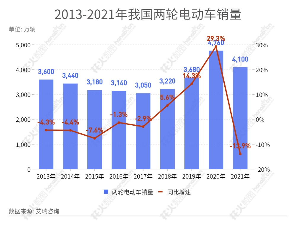 据艾瑞咨询的数据,2021年,我国两轮电动车市场增量空间几近见顶,当年,中国两轮电动车销量为4100万辆,相较于2020年,同比下跌13.9%。这是2018年以来的首次销量负增长,且跌幅创2013年以来的新低。