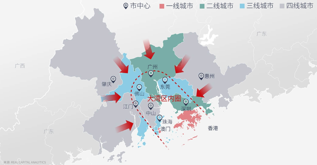 广佛肇、深莞惠-港,珠中江-澳。