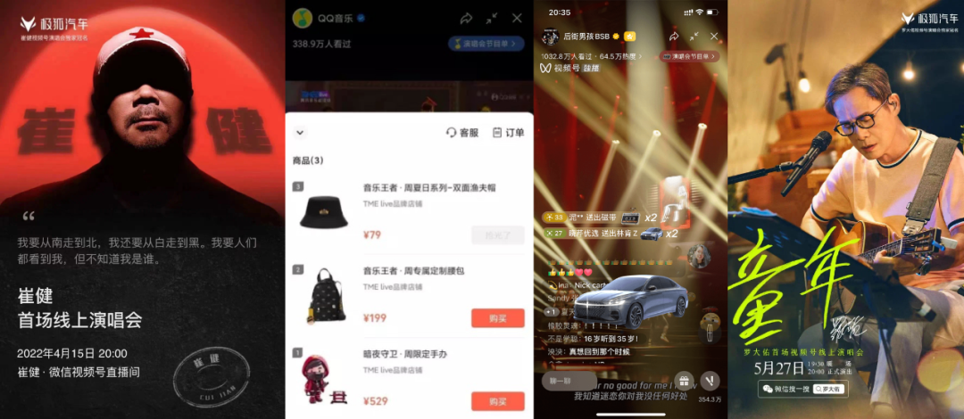 历经4次实操,当下视频号演唱会与品牌主的联动营销日臻成熟。最早(4月15日)极狐汽车冠名崔健演唱会,被认为是线上演唱会领域首次招到冠名商,据悉,那场演唱会冠名费用在千万元级别,极狐借全场Logo露出累计收获9000万用户触达,极狐微信指数峰值较活动前提升54倍、达历史最高。