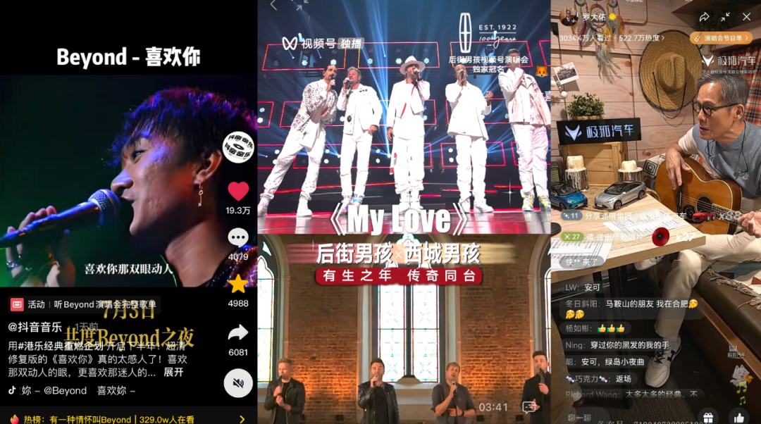 可以看到,相比一个多月前(5月27日),抖音携“孙燕姿线上唱聊会”与视频号“罗大佑首场线上演唱会”同天对垒,这一次,抖音在企划思路上进一步与视频号趋同。Beyond这场盛会被抖音称之为“港乐经典重燃企划”的开端,这与520时TME live借周杰伦演唱会发布的“奇迹现场重映计划”项目相似度极高。