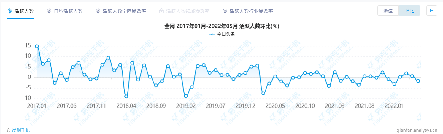 使用易观千帆数据查询,会发现字节系内容APP虽然生命力强悍,可仍逃不脱互联网内容平台的波动曲线,就是在达到一定峰值后,活跃人数会呈现缓慢下滑的过程,直至新一代内容产品对其进行替代。从天涯论坛、新浪博客到猫扑社区,无不遵循这个逻辑。根据易观千帆的数据可见,从2017年开始,今日头条的月活人数呈现着一个波段性下滑的趋势。