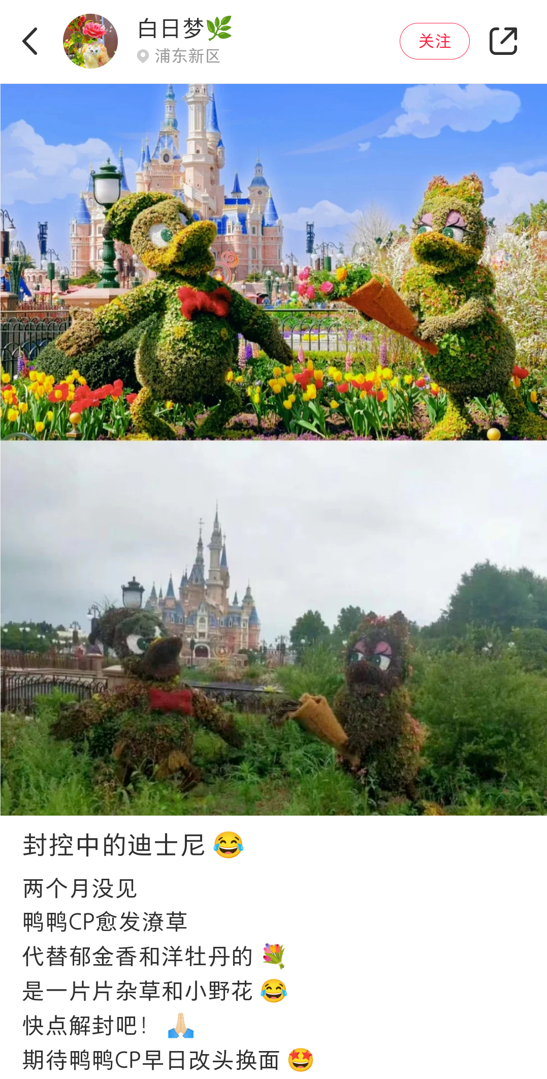 同样的场景在迪士尼上演,虽然与环球影城相比,迪士尼更为成熟,但因两个月未经修剪而愈发潦草的唐老鸭草木雕像,也在凸显它在疫情期间的不易。