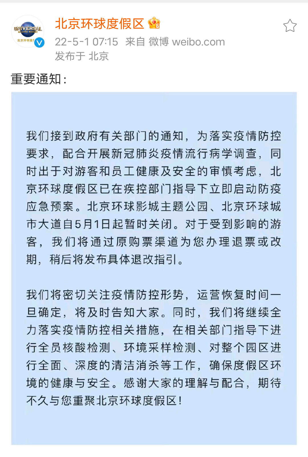 5月1日早晨,北京环球影城在微信公众号发布消息:接到政府有关部门的通知,为落实疫情防控要求,“北京环球影城主题公园、北京环球城市大道自5月1日起暂时关闭。”