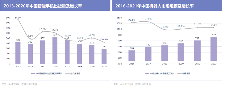 另一边,与手机产业链有着许多共通之处的机器人产业,正以年均近20%的增速,成长为千亿级市场。