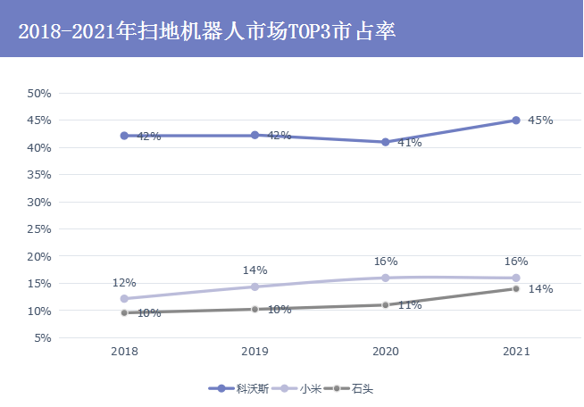 而这只会愈来愈难。从2018年至2020年,包括小米在内的Top3玩家市占率,从63.9%提升至75%。最近两年,除了小米市场份额维持在16%,其余两家厂商科沃斯和石头科技,市占率分别提升了4%和3%。这说明,在扫地机器人市场上,头部厂商的技术护城河积累愈来愈深,头部效应正在加强,留给后来者愈来愈少的机会。