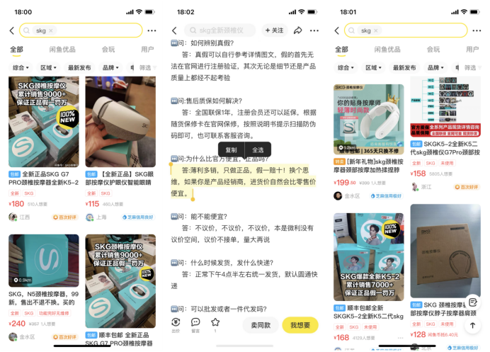 在闲鱼上搜索SKG按摩仪,你会发现,有大量的经销商,在以极低的价格(原价3折)售卖正品行货。而在详情页中,也写得非常直白,库存积压,低价出货,经销商价格,支持验真假。
