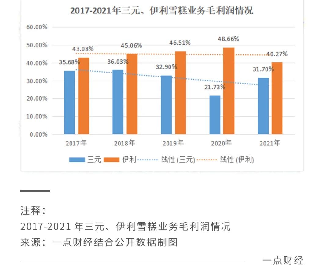 产品单价上涨,原材料价格可控,毛利润提高看似水到渠成,但事实并非如此。2021年三元和伊利雪糕业务的毛利分别为40.27%、31.7%,不及5年前水平。