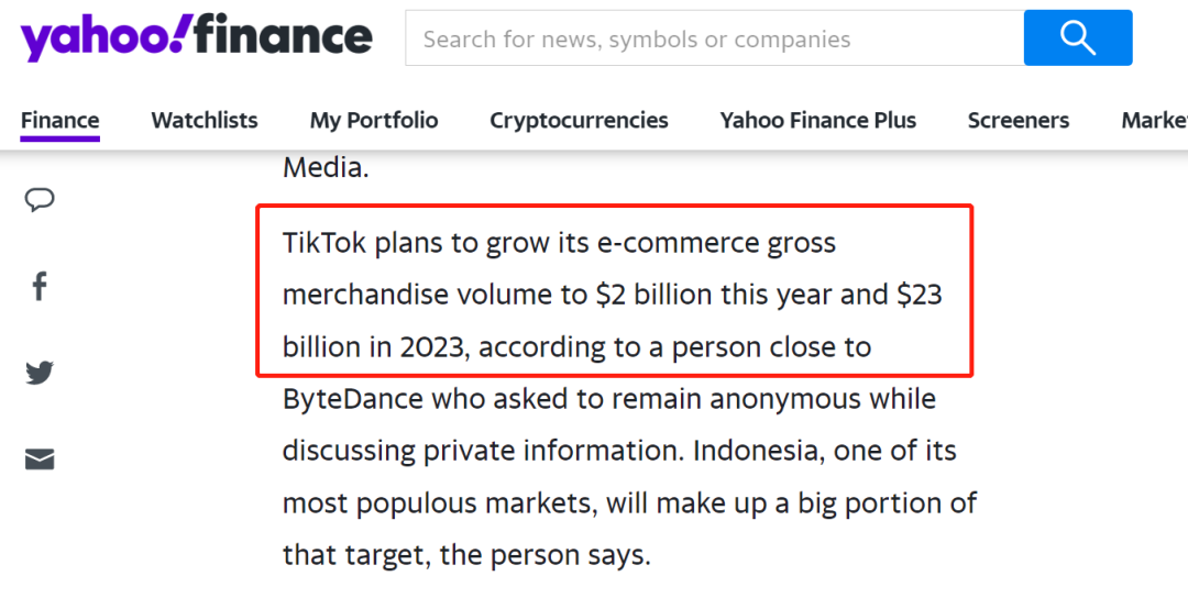 据彭博社及雅虎财经报道,字节某消息人士称,2022 年,TikTok 电商业务的交易总额目标是 20 亿美元,到 2023 年的年度电商交易总额目标是 230 亿美元,也就是比 2022 年增长 10 倍还多。