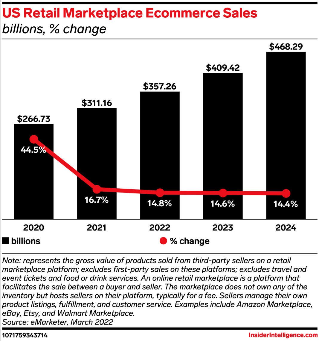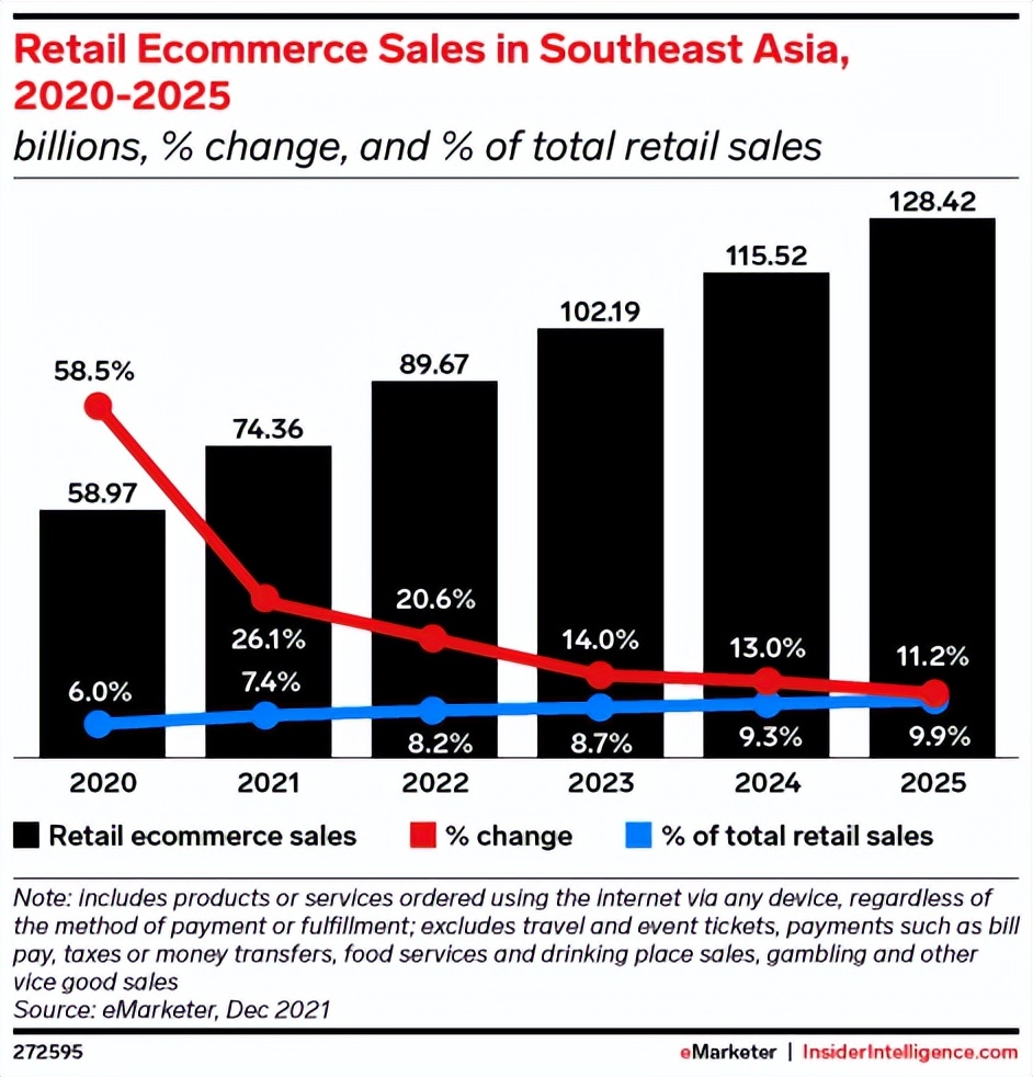 eMarketer 数据显示,东南亚的电商销售额在 2020 年较上一年增长了 58.5%,不过从 2022 年开始至 2025 年,东南亚电商规模增速将会放缓,增长率不超过 15%。