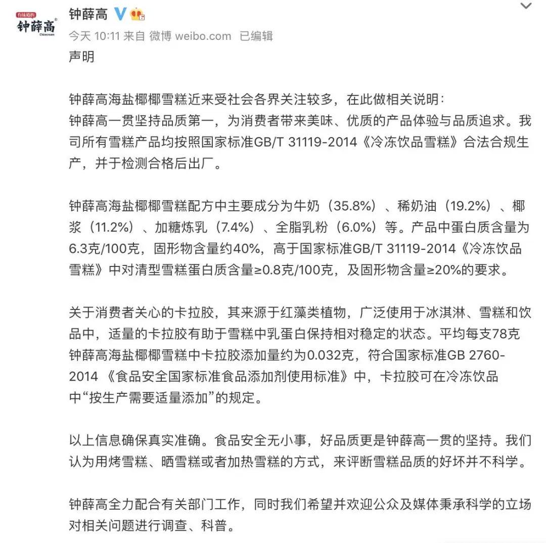 对此,钟薛高很快作出了回应,总结来说大致有三点:第一,关于原料成分,钟薛高雪糕合法合规生产、检测合格出厂,产品中蛋白质含量还高于国家标准;第二,关于稳定剂,冰淇淋、雪糕中普遍含有卡拉胶,钟薛高的添加量符合国家标准,而且是为了让雪糕中乳蛋白保持相对稳定状态;第三,关于“烧不化”,通过烤雪糕、晒雪糕或加热雪糕,来评断雪糕品质的好坏,不科学。