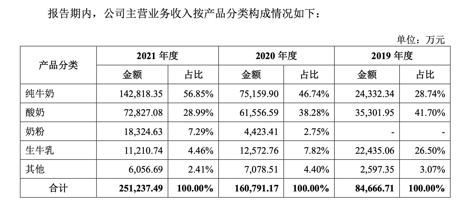 招股书显示,报告期内,认养一头牛主营业务收入主要来源于纯牛奶、酸奶、奶粉等乳制品以及生牛乳,上述各类产品各期收入占主营业务收入的比例分别为96.94%、95.59%和97.59%。