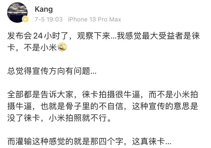 “发布会24小时了,观察下来……我感觉最大受益者是徕卡,不是小米。”网友@Kang的感想,在微博上得到了1800多人的共鸣。无论是前期预热时雷军转发的多条徕卡相关微博,还是发布会上徕卡的绝对C位,抑或是“这真徕卡”这句洗脑效果十足的广告语,似乎都把徕卡视为此次小米12S的最大亮点,甚至遮蔽了小米品牌自身。