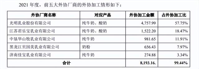 此外,认养一头牛的奶源并非全部都是“自有奶源”。招股书显示,光明乳业、君乐宝、中垦华山、贝因美、佳宝乳业等厂商均为其代加工厂。这也意味着,认养一头牛的部分产品为贴牌牛奶,独立生产能力并不突出。