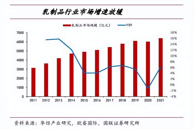 而且,随着乳制品行业增速逐渐放缓,据资料显示,目前乳制品行业正从增量转向存量竞争,我国乳制品行业2015年规模为4896亿元,行业增速见顶,之后增速逐年下滑,从量增驱动转向价增驱动。