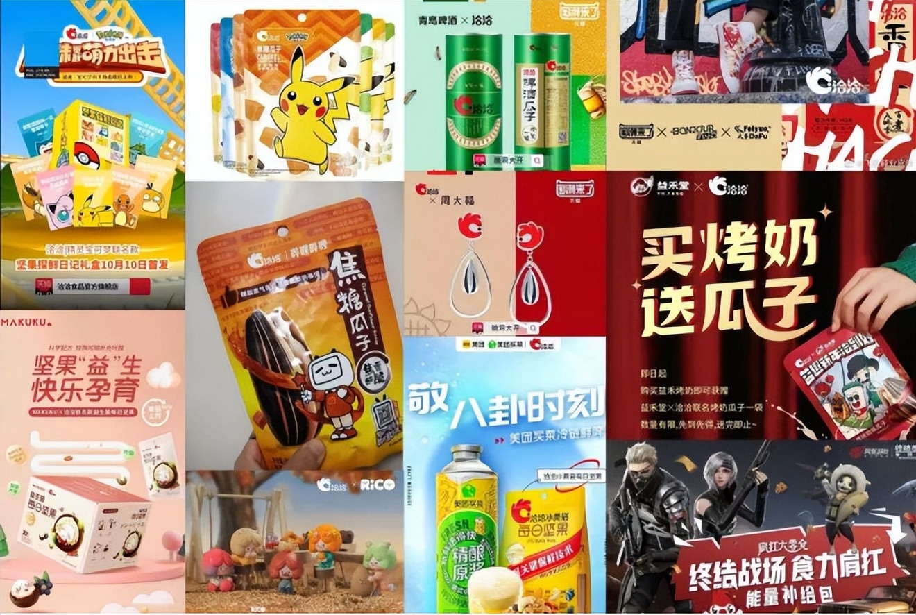 风味化瓜子联名这条道路走不通,洽洽又将目光转移联名零食包。与《狼人杀官方》、《终结者2》、《欢乐斗地主》等游戏合作,与安慕希、芬达、五谷道场、卫龙、芬达、康师傅等休闲零食品牌合作,与Keep、哔哩哔哩等平台合作,吃喝玩乐,洽洽也合作了个遍。