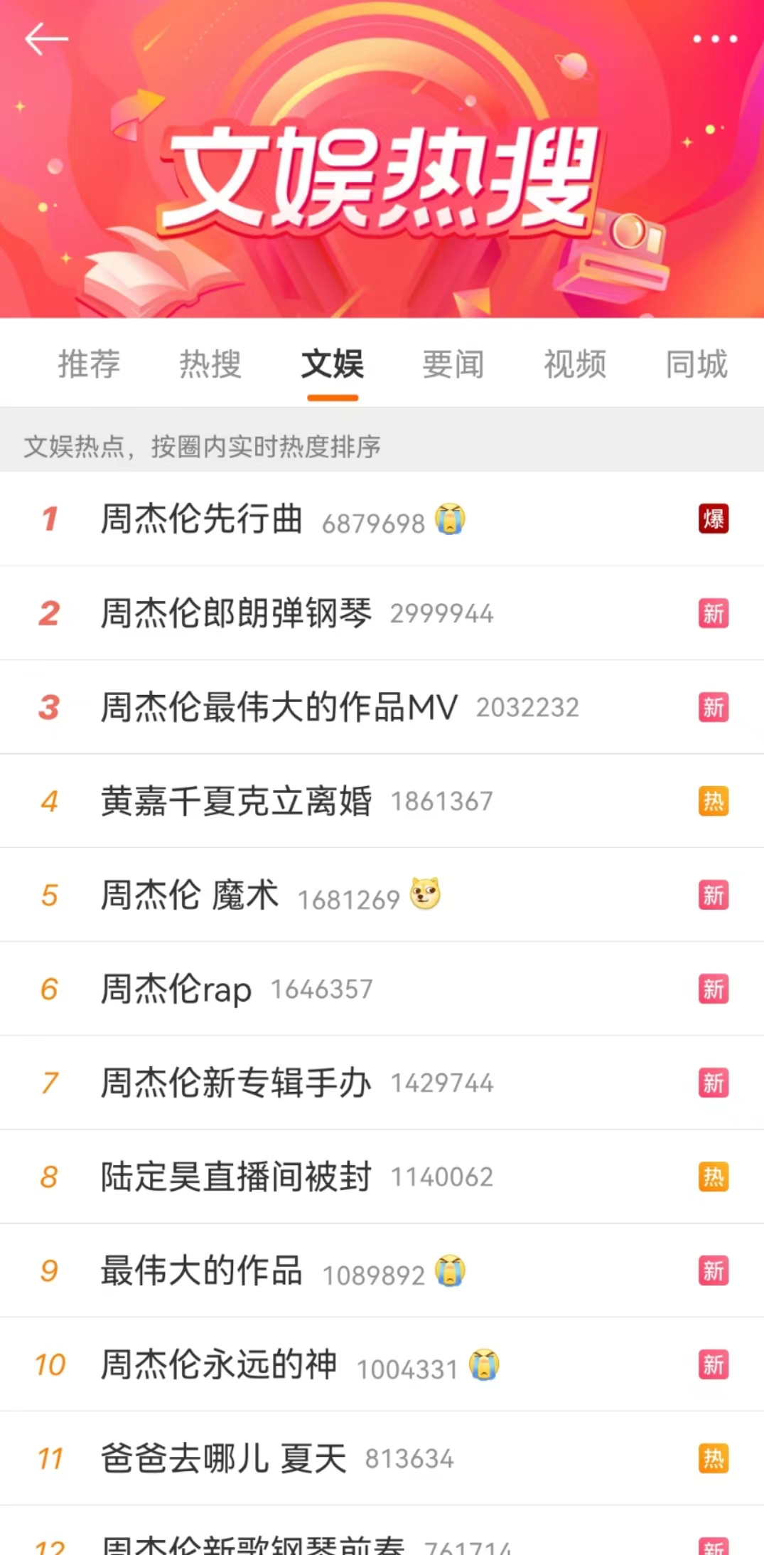 微博上#周杰伦先行曲#不但冲上热搜一位,甚至都“爆”了。截止发稿前,该话题阅读次数达到7.6亿。更夸张的是,文娱版块前十个热搜话题,有八个与周杰伦新专辑相关。