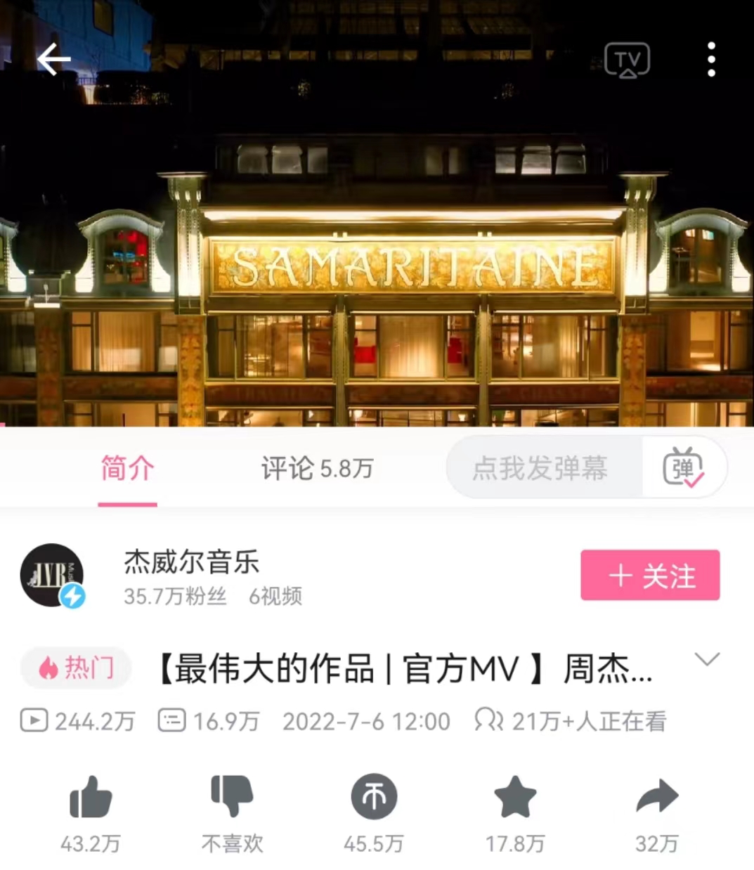 7月6日, 《最伟大的作品》在B站迎来MV首播,场面同样壮观。开播一个小时B站观看量达到244万,21万+正在看。
