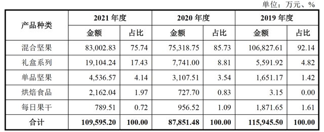 沃隆食品十分依赖混合坚果。据招股书显示,2019年至2021年,沃隆食品混合坚果销售收入占总收入的92.14%、85.73%、75.74%,虽收入占比逐年下滑,但仍为沃隆食品核心收入来源。