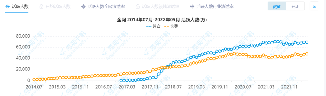 但在抖音入场后,快手在短视频领域的霸主地位遭到了挑战。“南抖音北快手”的局面持续一段时间后,后来者抖音在2018年实现了逆转。易观千帆数据显示,2018年5月抖音的全网活跃人数数据首度超越快手,并在往后将差距不断扩大。截止2022年6月,抖音全网活跃人数为6.95亿,而快手却只有4.8亿。