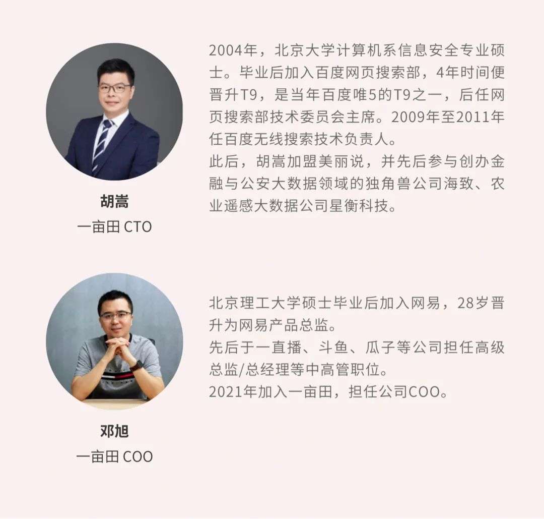 胡嵩是技术大牛,百度原网页搜索部技术委员会主席,后曾创业农业遥感大数据公司,与农业结缘。邓旭原来是网易最年轻的产品总监,后在一下科技(一直播/小咖秀)、斗鱼和车好多(瓜子/毛豆)担任过中高管职位,做过线上线下的信息服务和交易履约服务,对媒体和社交业务也很熟悉。