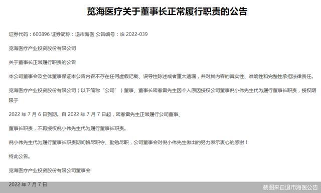 7月6日,览海医疗产业投资股份有限公司(600896.SH,以下简称:览海医疗或退市海医)披露公告称:“自2022年7月7日起,密春雷先生正常履行公司董事、 董事长职责,不再授权倪小伟先生代为履行董事长职责。”