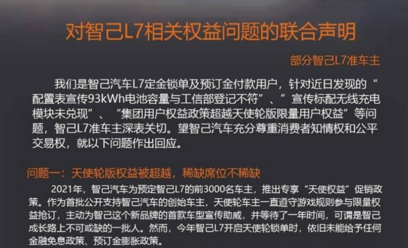 但仅仅不到一个月的时间,102位智己L7“天使轮”车主就于5月28日发表了一份名为《对智己L7相关权益问题的联合声明》。